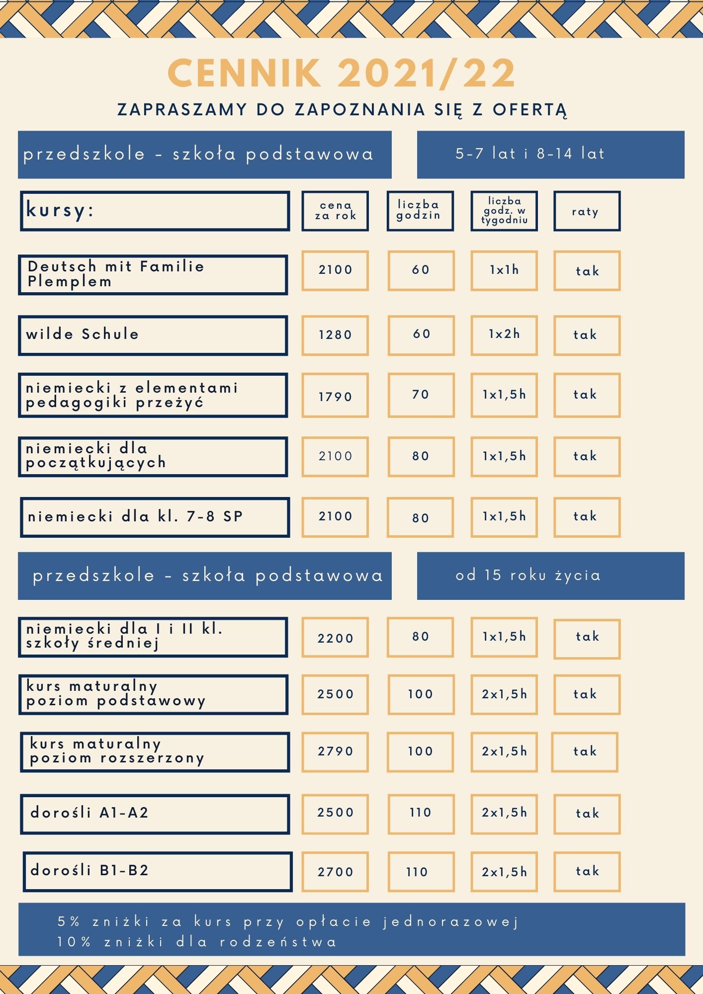 Prestige Grupa- do 3 osób-koszt kursu ustalany indywidualnie w sekretariacie Deutsche Schule.